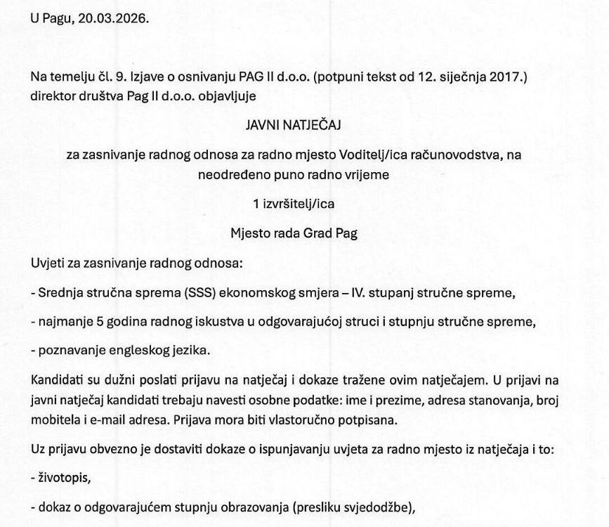 JAVNI NATJEČAJ – za zasnivanje radnog odnosa za radno mjesto Voditelj/ica računovodstva, na neodređeno puno radno vrijeme – pogledaj dokument